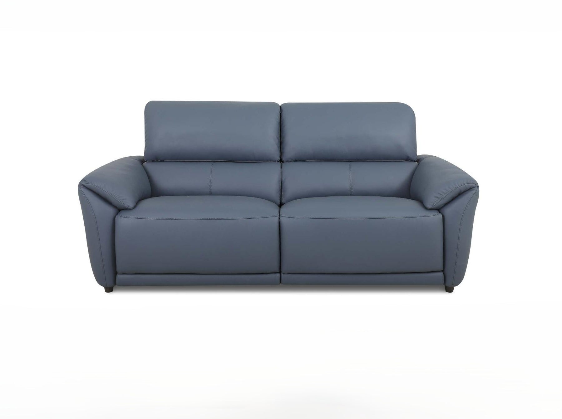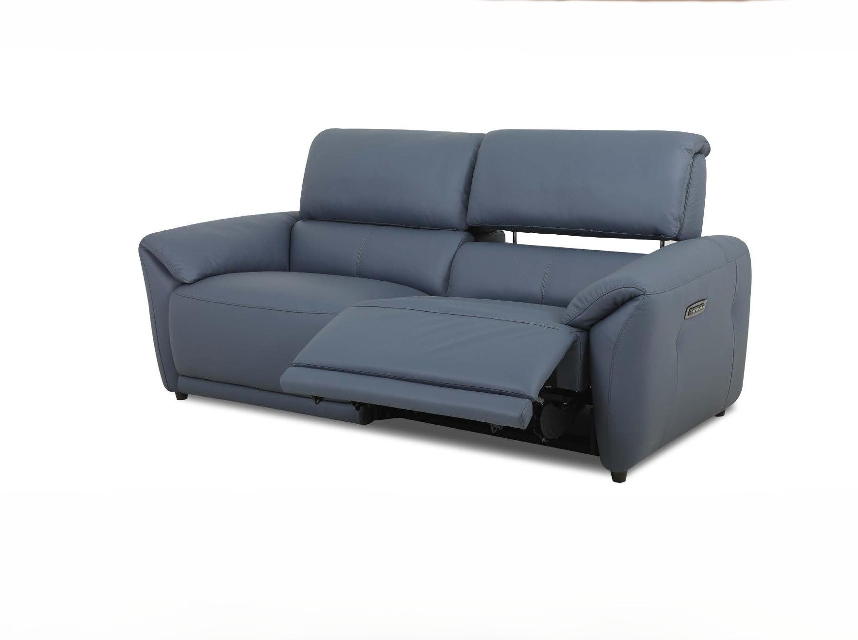 Blue leather sofa with recliner feature and adjustable headrest on a white background