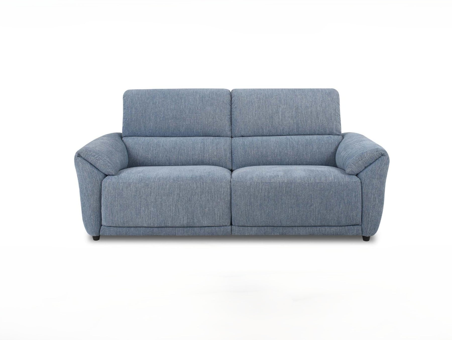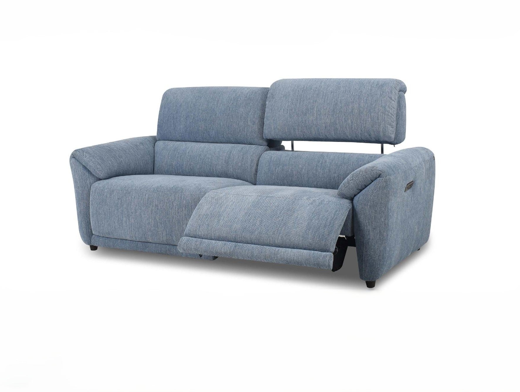 Blue fabric sofa with recliner feature and adjustable headrest on a white background